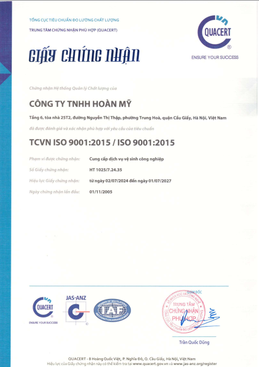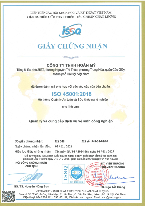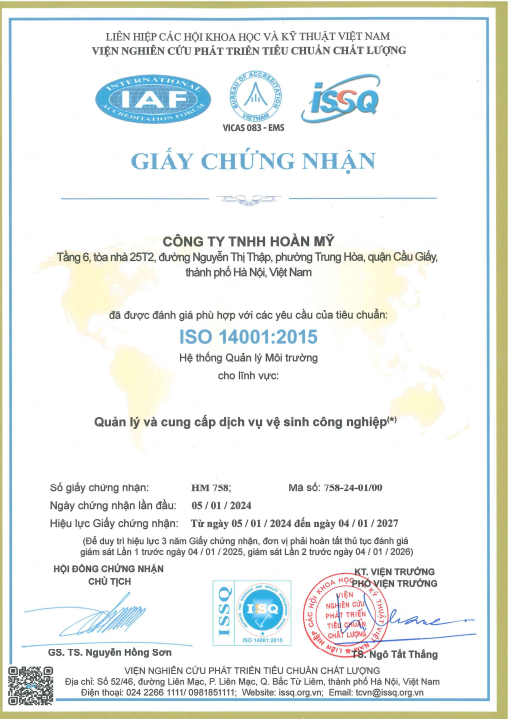 Đặc biệt, bộ ISO 9001:2015, ISO 14001:2015 và ISO 45001:2018 chính là kiềng ba chân vững chắc, “tiêu chuẩn vàng Chất lượng – Môi trường – An toàn”  khẳng định sự chuyên nghiệp, uy tín của công ty Hoàn Mỹ.