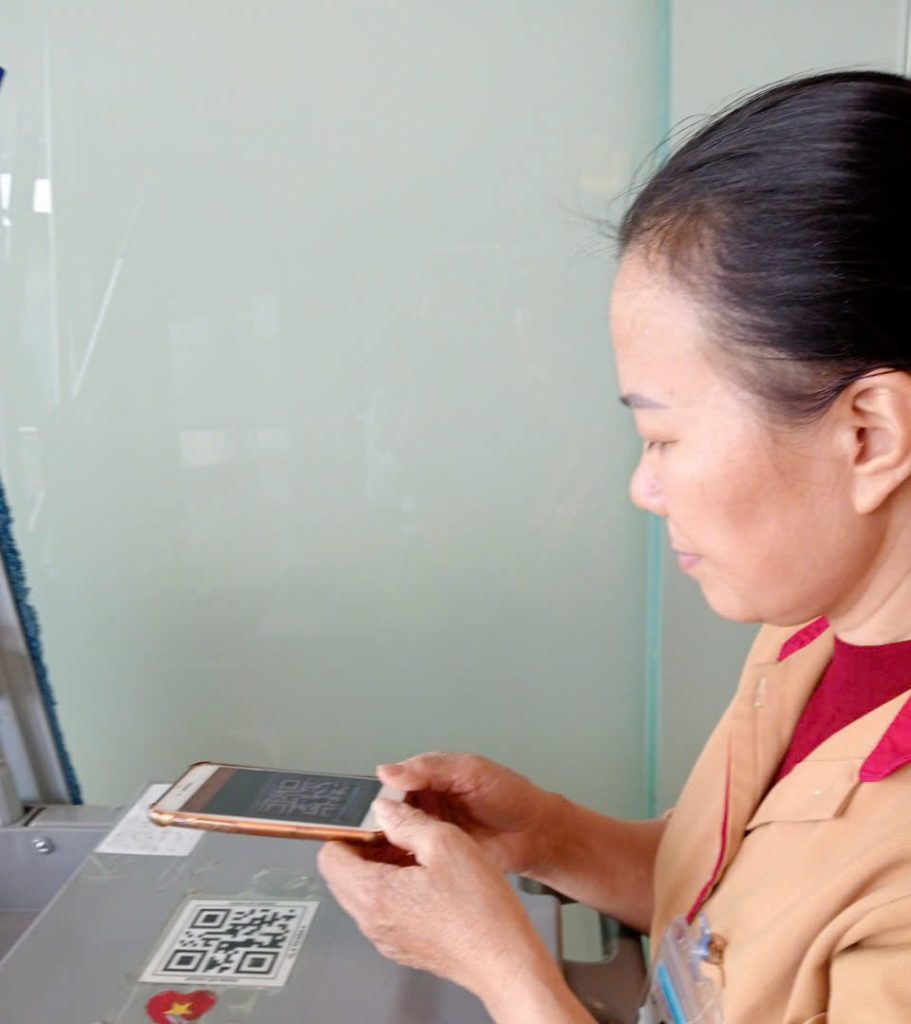 Nhân viên công ty Hoàn Mỹ quét mã QR, báo cáo công việc trên hệ thống app HM